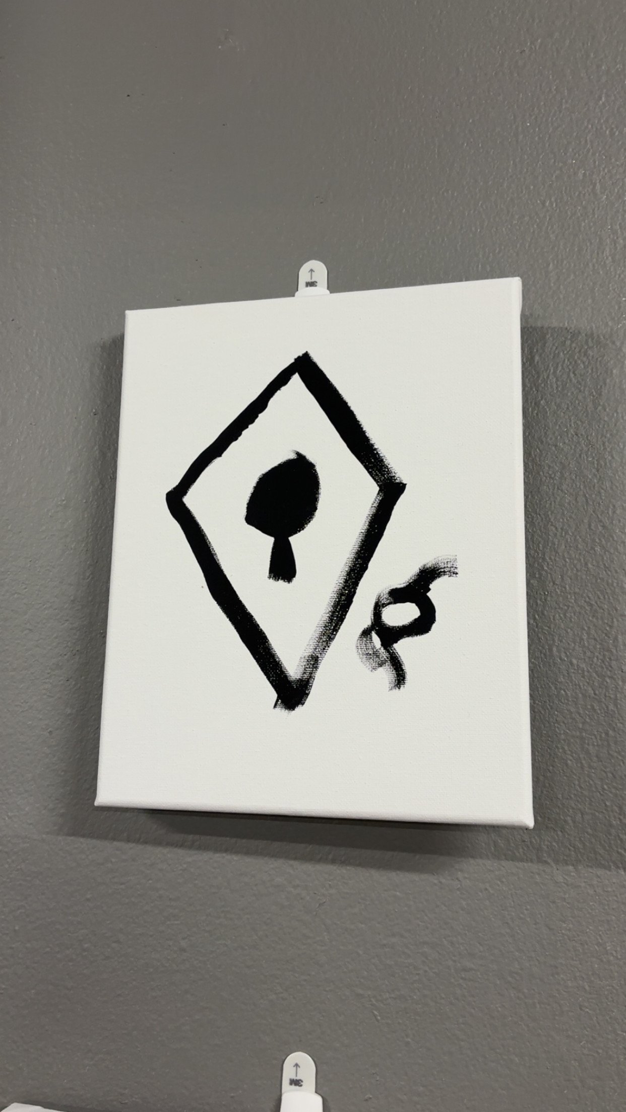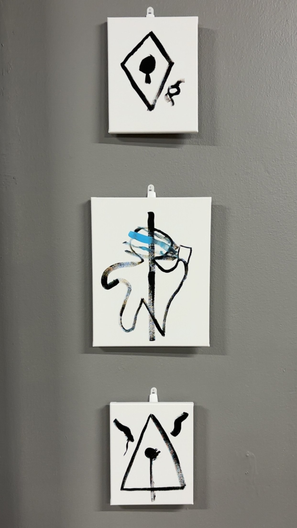 Silent Emblems presents three contained forms — glyph-like structures held within open white fields. Each canvas carries a central mark framed by restraint, allowing symbol and space to coexist without explanation.
