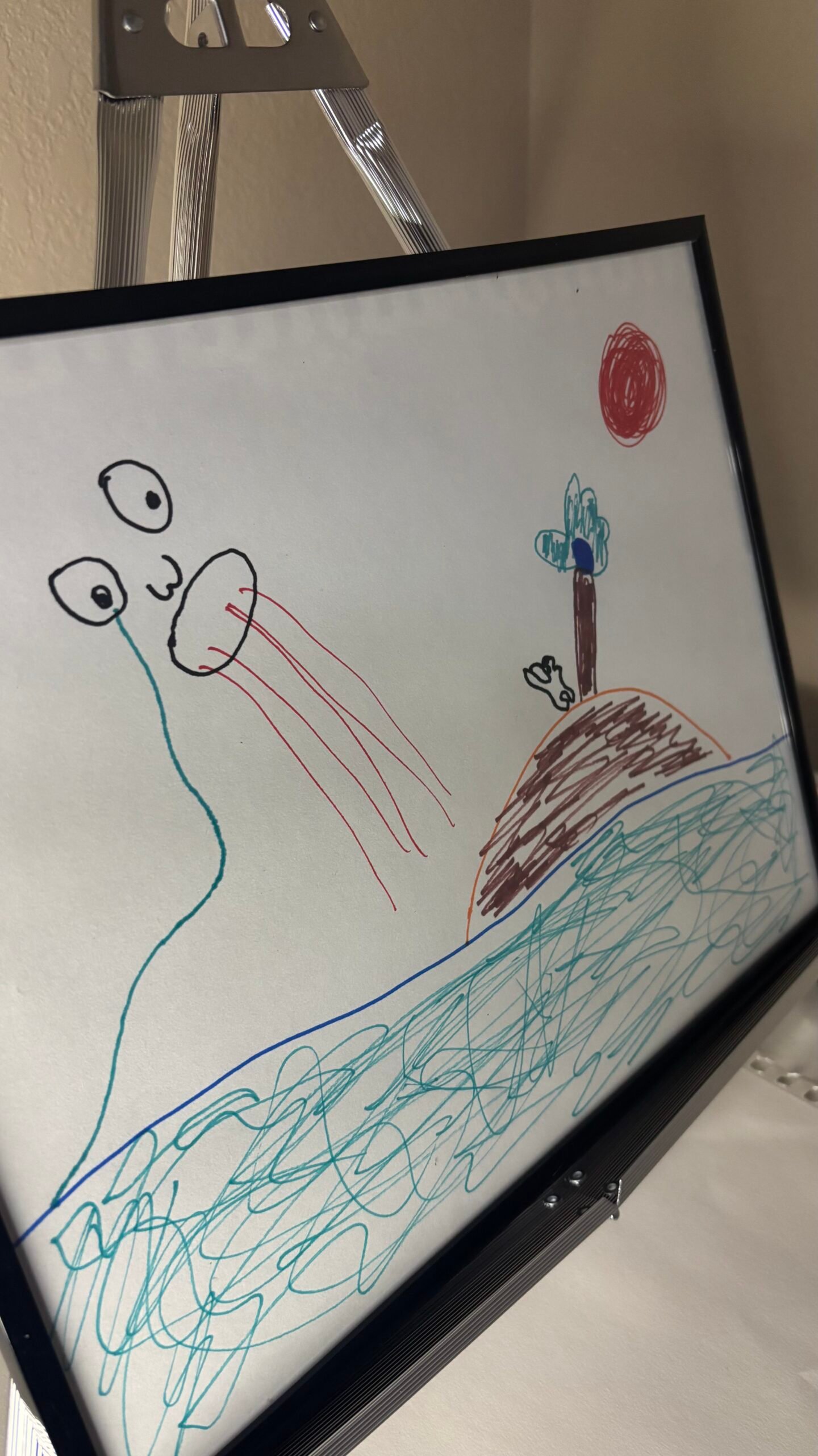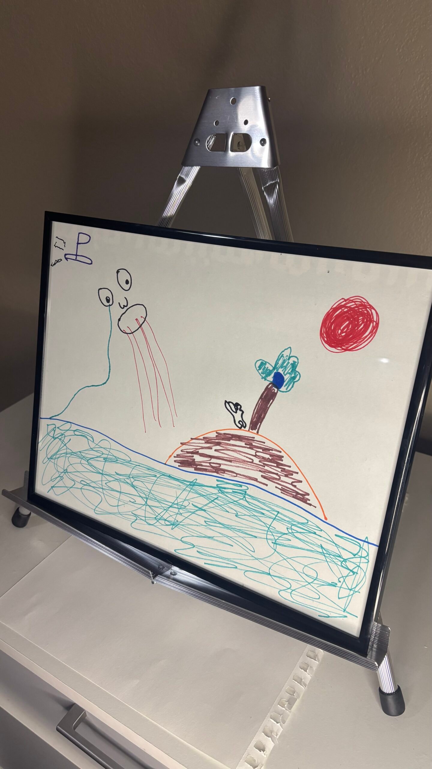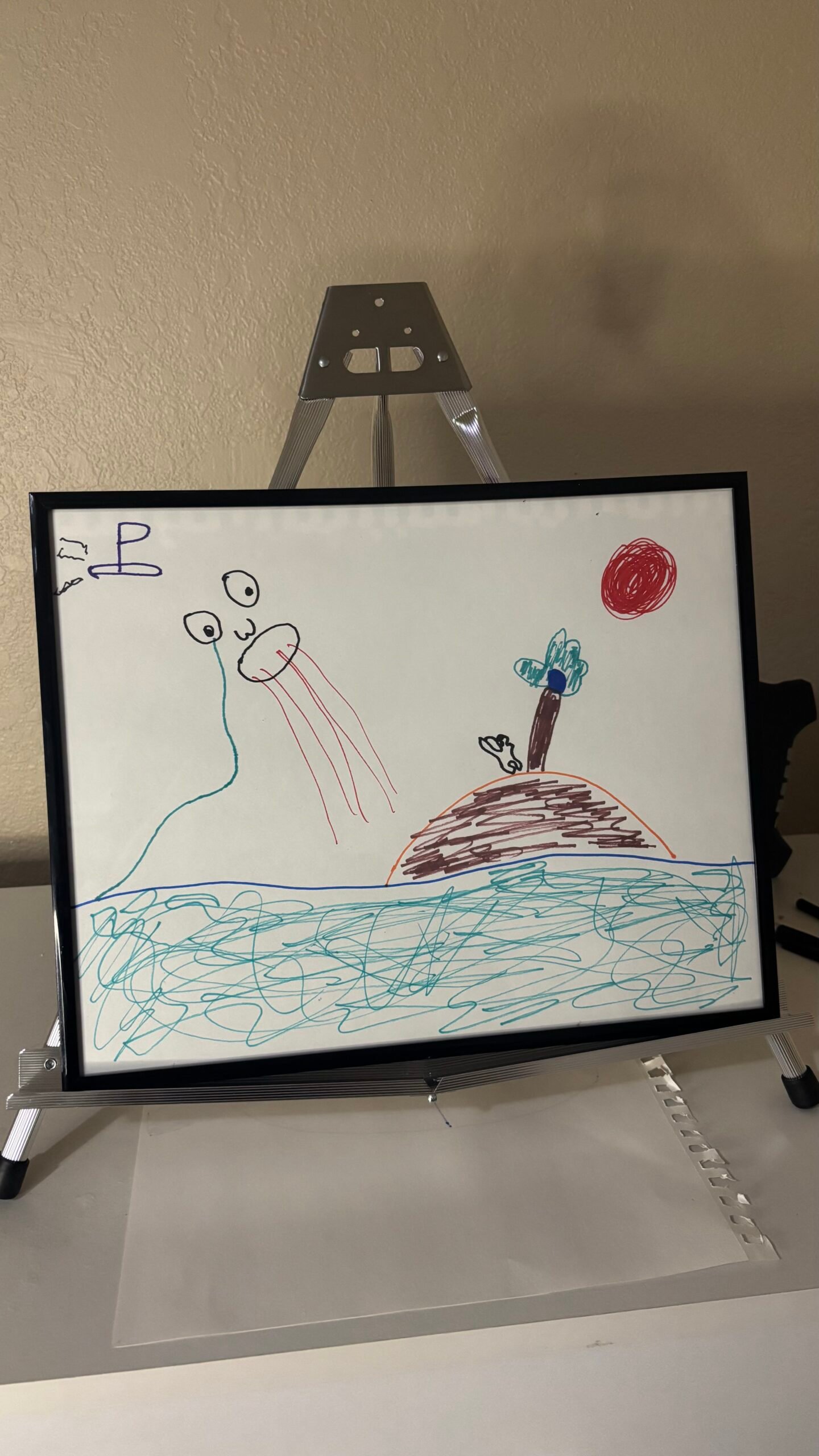 Marker on paper, 11 × 14 (framed)Figurative / Narrative Symbols Someone Was Watching presents a solitary landscape suspended between presence and observation. A distant figure emerges from the water while a small island, tree, and red sun occupy the horizon. The composition suggests awareness without interaction — a moment where attention exists but remains unacknowledged….