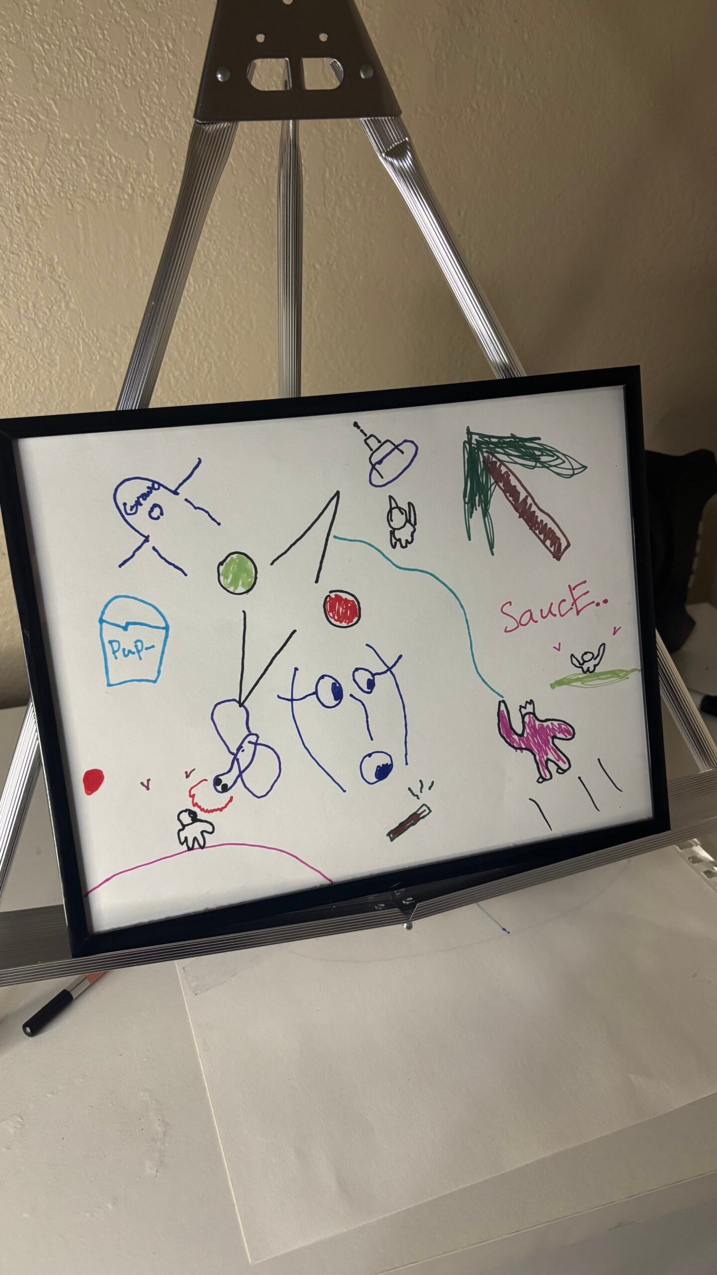 In Too Many Signals, symbols collide without hierarchy.A face absorbs transmissions. A palm tree leans over a fragmented sky. A small figure gestures toward something unseen. “Sauce” floats like a coded whisper. Nothing dominates. Everything competes. This piece explores overstimulation — the feeling of being surrounded by messages, symbols, and noise without clear meaning. It…