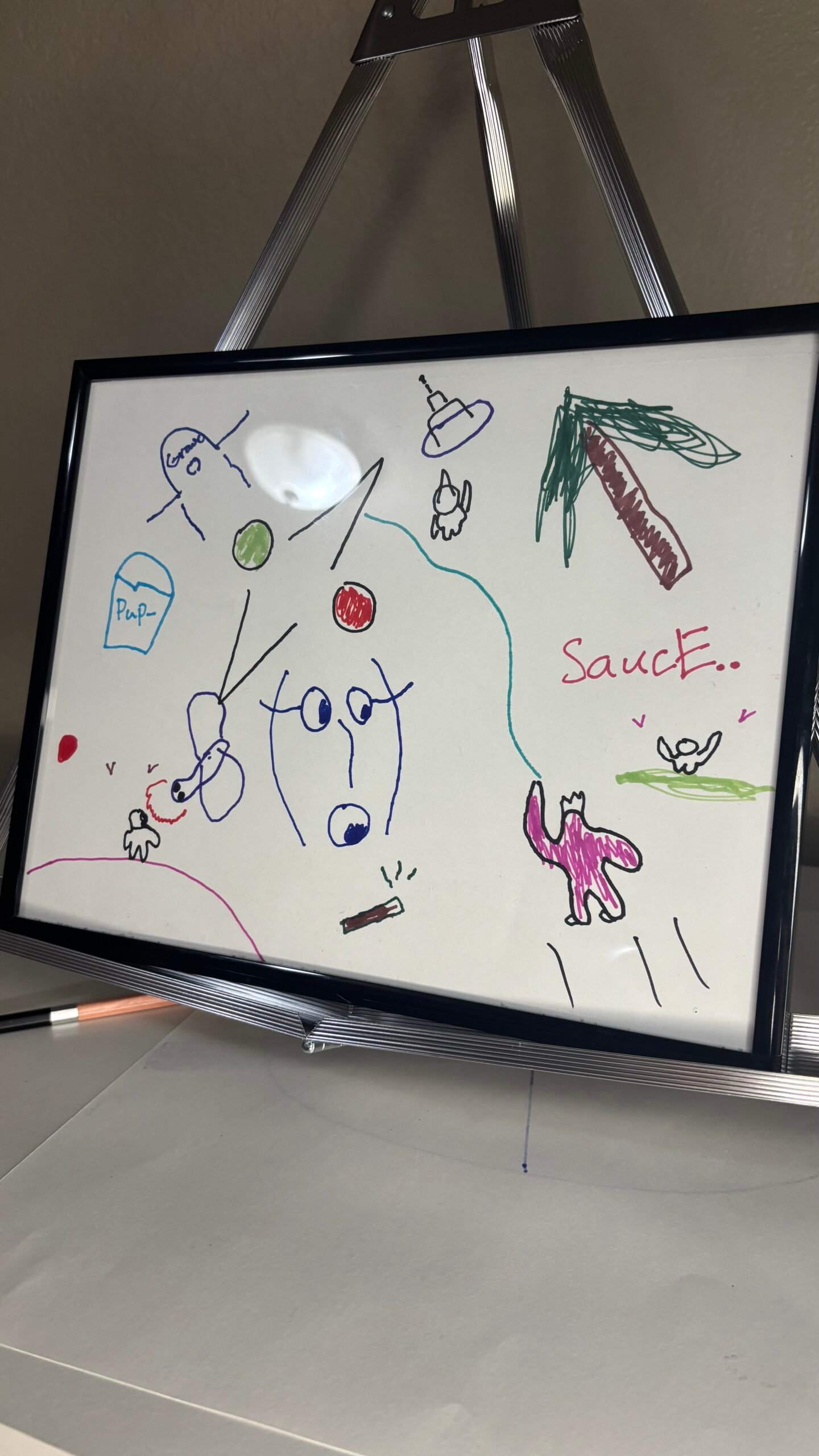 A face absorbs transmissions. A palm tree leans over a fragmented sky. A small figure gestures toward something unseen. “Sauce” floats like a coded whisper.